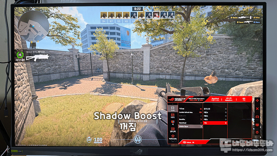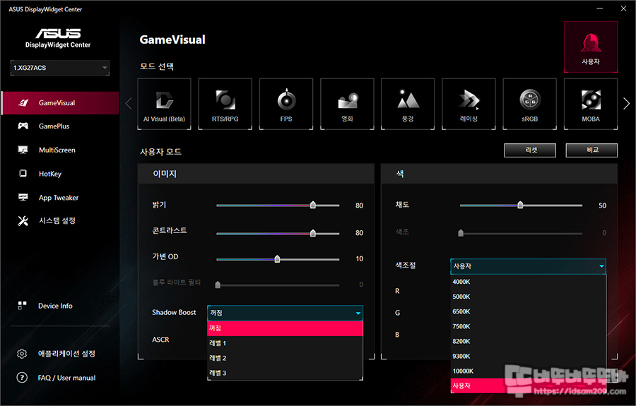 또한 ASCR(Asus Smart Contrast Ratio) 기능은 화면의 동적 명암비 어두운 장면이 많이 등장하는 화면에 효과를 볼 수 있는 기능이지만 ELMB 기능 사용 여부에 따라 활성화 또는 비활성화로 표현되니 각각의 기능의 연동에 따른 사용 여부를 잘 살펴보셔야 합니다.