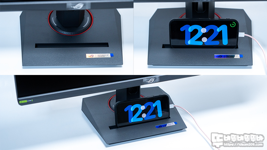 특히 모니터 받침대에는 스마트폰 거치가 가능 홈이 있어 사진과 같이 스마트폰을 옆으로 거치하여 사용이 가능한데 아이폰의 경우 충전하면서 가로로 놓으면 탁상시계 효과를 지원하는 은근히 찰떡궁합이네요.