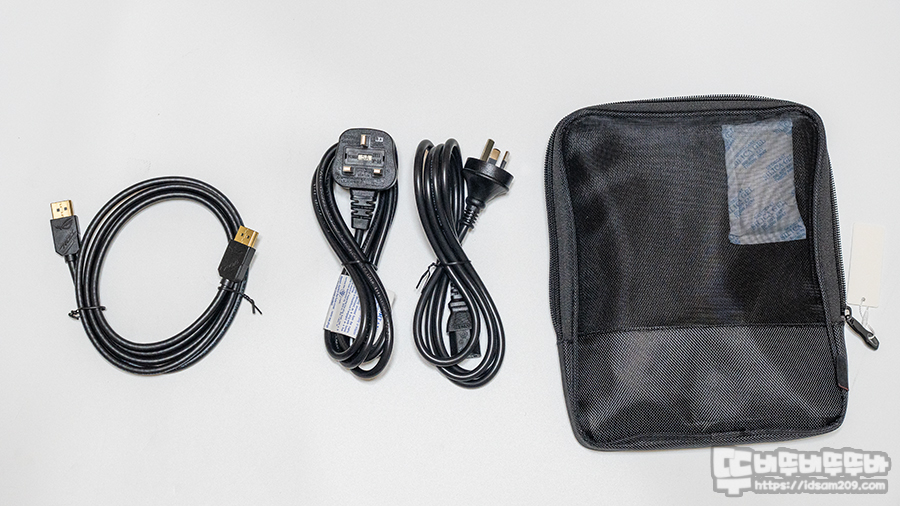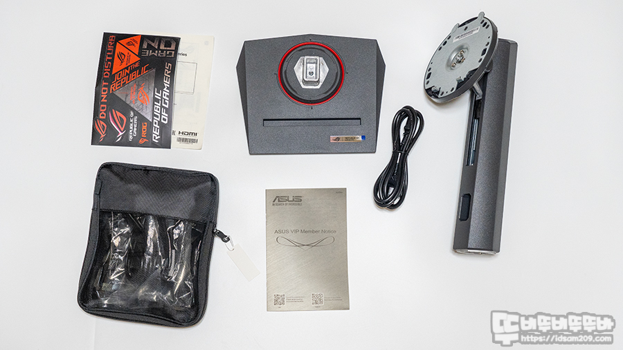 모니터 본체를 제외한 구성품으로 ROG 로고 스티커류와 사용 설명서, 받침대, 스탠드, 220V 전원 AC 코드 그리고 파우치에는 DP to DP 케이블과 다양한 나라에서 사용할 수 있는 AC 케이블이 2종류가 들어있네요.