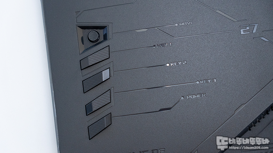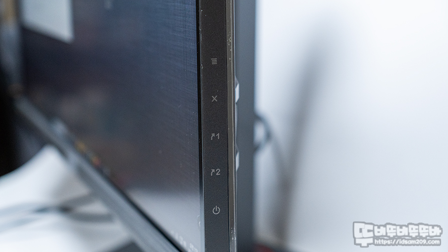 모니터 측면은 후면의 기능 버튼에 대한 표기를 확인할 수 있는데 후면의 각인과는 통일성이 없어 보이네요.