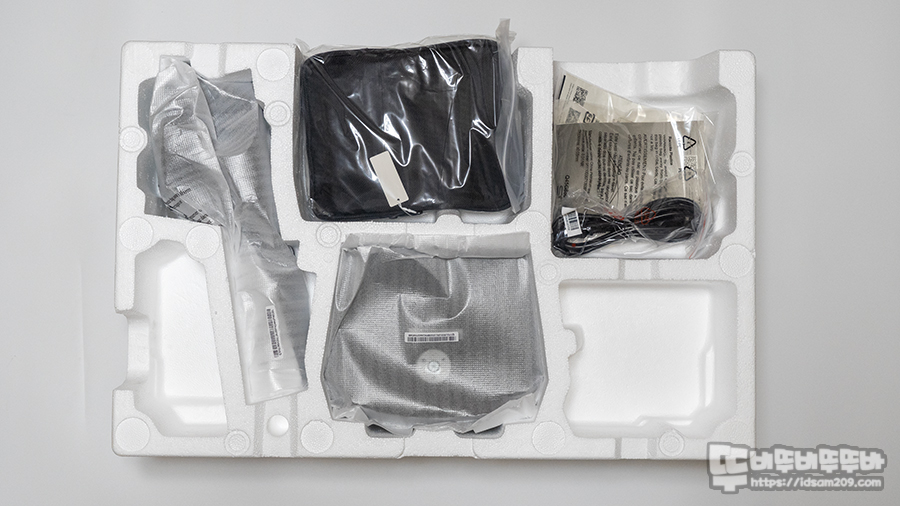 패키지 개봉 시 이중으로 구성된 스티로 폼 중 모니터 후면 쪽에는 스탠드와 받침대 글로벌 전원 케이블과 DP 케이블이 들어있는 파우치와 별도의 220V 전용 전원선과 사용 설명서 등이 섹션 별로 잘 구분되어 안정감을 주었습니다.