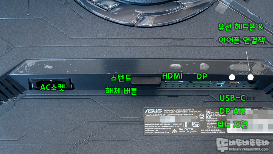 모니터 뒤쪽 아랫부분에 위치한 I/O 포트는 AC 소켓, 스탠드 해체 버튼, HDMI 2.0 포트, DisplayPort 1.4 포트, USB Type-C (DP Alt Mode) 그리고 헤드폰 또는 이어폰 잭으로 구성되어 있고요.