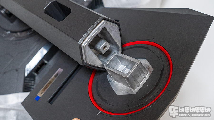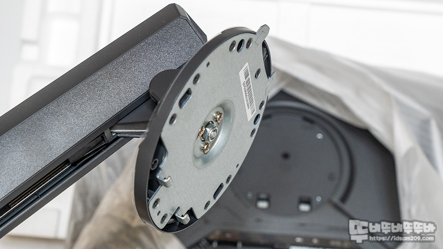 제품 개봉 후 모니터 뒷면에 스탠드 연결 부를 윗부분을 연결 후 아래를 누르면 딸깍하며 원터치로 결합이 됩니다.