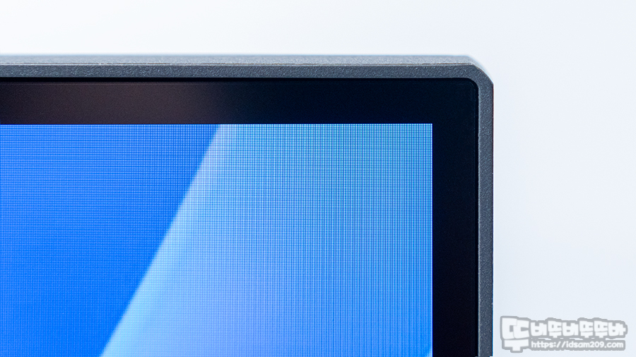 모니터의 오른쪽 측면에는 제품의 특징을 표현하는 종이가 부착되어 있으며 종이를 제거하면 얇은 프레임과 패널 끝부분인 검정색으로 표현되는 이너 베젤을 확인할 수 있습니다.