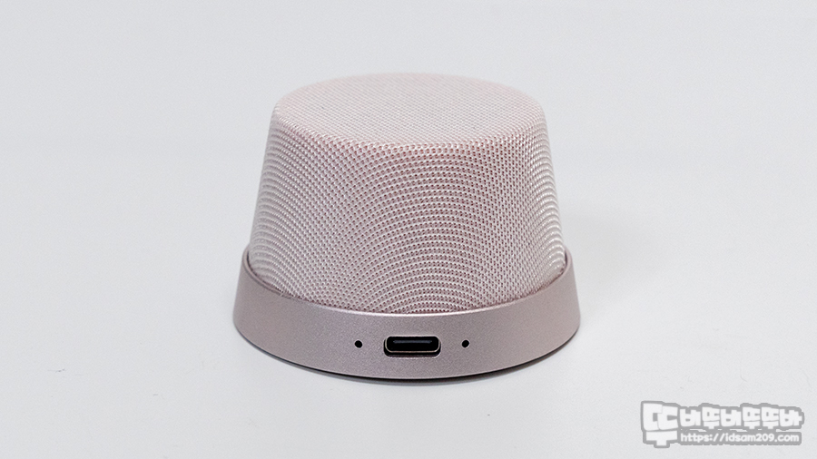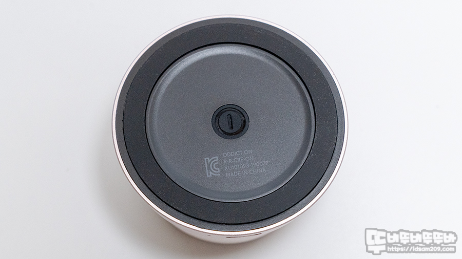 바닥면에는 동그란 띠 모양을 하고 있는 원형 마그네틱 그리고 가운데에 전원 On/Off 스위치 모습을 확인할 수 있는데 일반적인 블루투스 스피커처럼 컨트롤 버튼이 있는 게 아니어서 페어링 이후에는 스마트폰을 이용하여 미디어 재생 및 볼륨 제어를 하는 형태로 심플하게 사용할 수 있습니다.