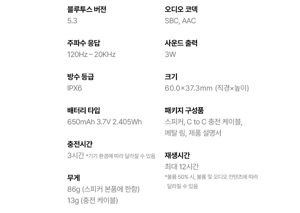 블루투스 버전 5.3 / 지원 코덱 : SBC, AAC / 드라이버 유닛 40mm / 출력 3W / IPX6 방수 지원 / 650mAh 배터리 내장 / 충전 3시간 / 재생 12시간 / 무게 86g 등의 정보를 확인할 수 있습니다.