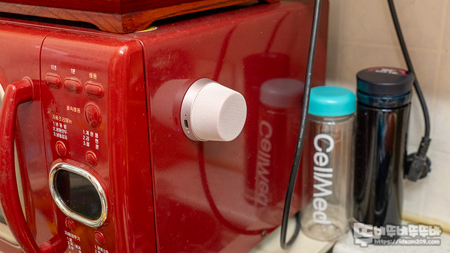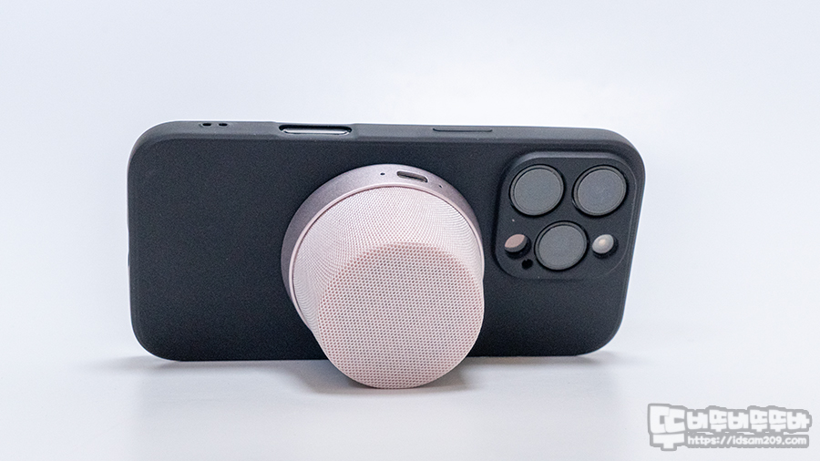 제품의 디자인 특성상 상단의 타공면을 통해 소리가 발산되는 만큼 위쪽 부분은 막으면 소리 전달에 문제가 있으니 맥세이프 거치로 사용하시거나 자석 부착이 가능한 메탈 소재에 부착 또는 제품에 제공되는 메탈 링을 이용하면 어디든지 부착이 가능하니 참고하시고요.