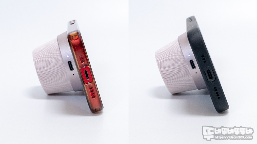 확실히 사이즈가 큰 아이폰 16 Pro 쪽이 살짝 뒤로 더 넘어가는 경사각을 보여주지만 맥세이프 결합으로 꽤 안정적으로 유지됩니다.