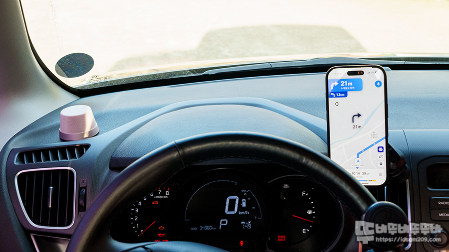 차량 대시보드에 평편한 부분이 왼쪽밖에 없어 그네틱 링을 부착하여 오딕트 On를 부착하고 스마트폰과 블루투스 연결로 내비게이션 사운드를 들으면서 운전 중 전화가 오면 전화 통화도 하고 편리하게 사용할 수 있었습니다.