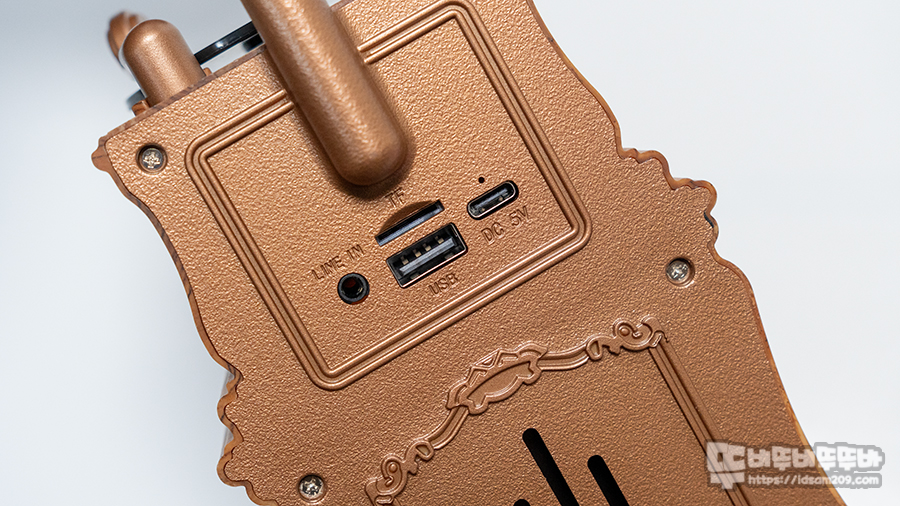 고풍스러운 그릴 느낌의 아랫부분은 정격 7W 52mm 유닛이 내장되어 선명한 사운드를 들려주며 제품 뒷면에는 USB-C 충전 단자와 USB-A 메모리 단자, MicroSD 슬롯, 외부 소리를 연결할 수 있는 AUX in 단자로 구성된 것을 확인할 수 있습니다.