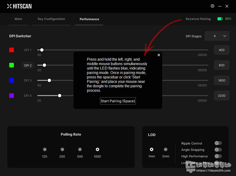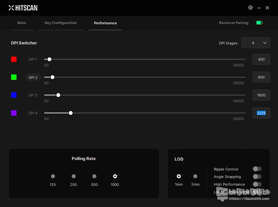필자가 리뷰하는 제품은 기본 1K 동글을 사용하기에 프로그램 상에서는 1000Hz까지 사용이 가능하며 그 외로 LOD 설정 리플 컨트롤, 앵글 스냅핑 그리고 무선 사용 시 성능을 중요시하는 High Performance와 안정성을 높이는 Long Distance Mode 선택을 지원합니다.