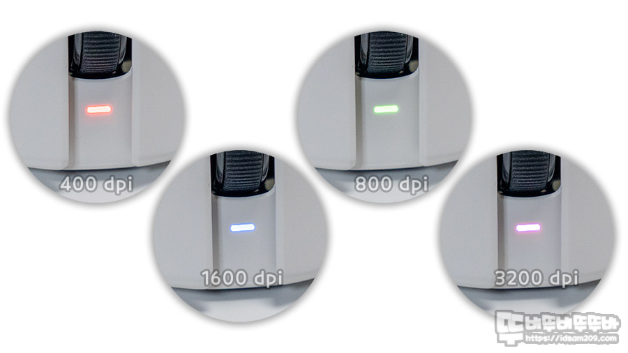 마우스 전면에 표현되는 DPI 별 LED 인디케이터 모습.
