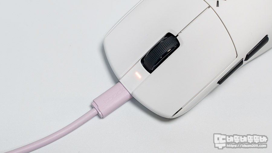 마우스 충전 시 휠 스크롤 앞쪽에 위치한 LED 인디케이터가 오렌지 컬러로 점멸하여 충전을 하며 완충 시 블루 컬러 점등으로 완충되었음을 알려주며 풀 충전 시 약 75시간(1K 기준) 사용이 가능합니다.