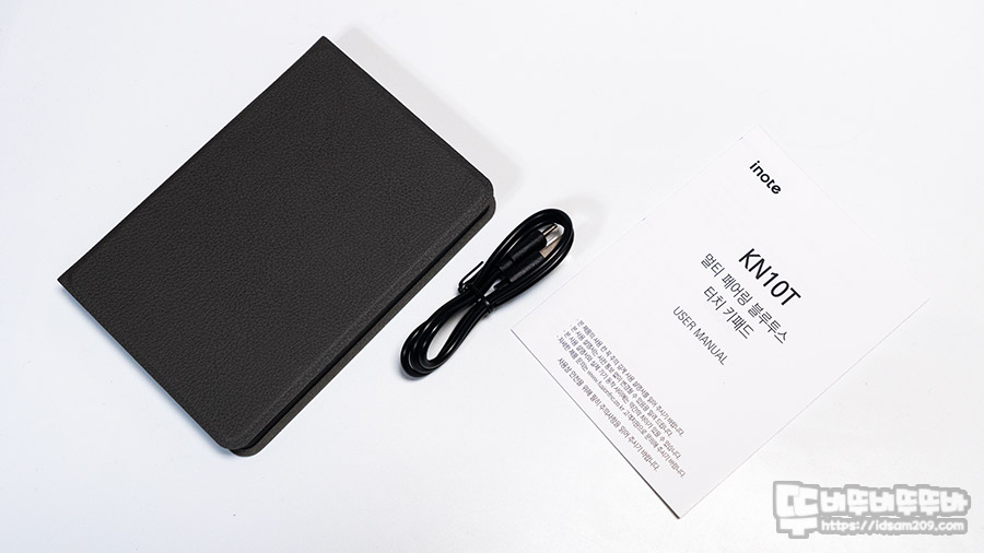 제품은 아이노트 KN10T 본체, USB-C to A 충전 케이블, 사용 설명서로 구성되어 있습니다.