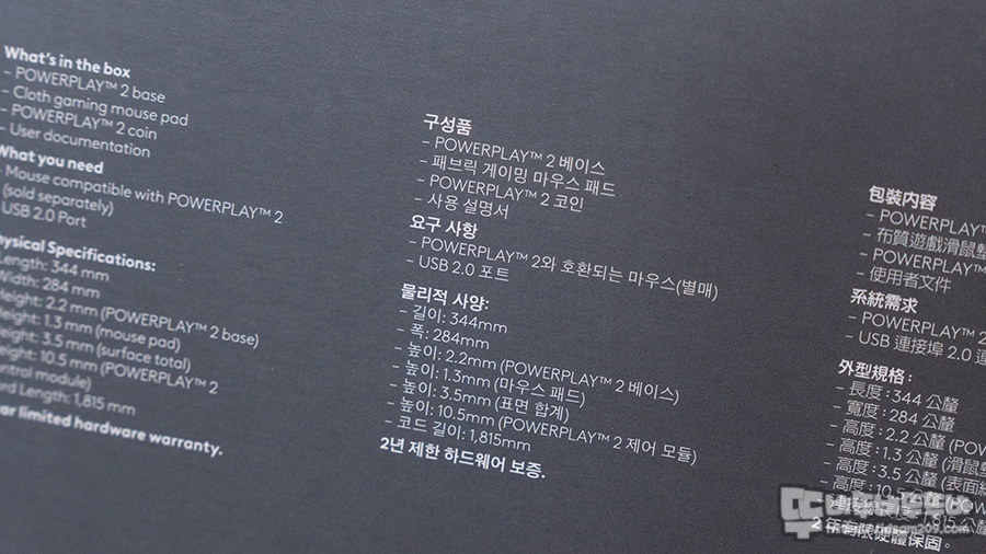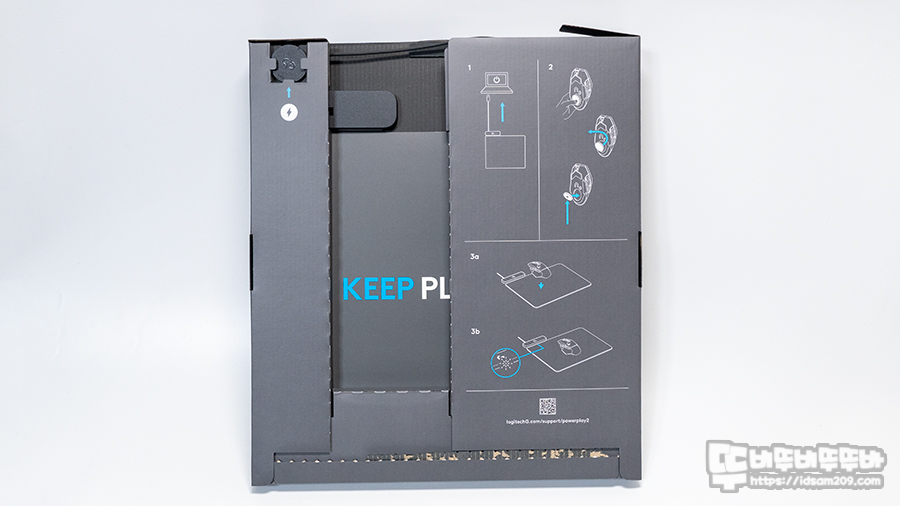 패키지에는 파워플레이2이라는 새 모델과 무선 충전 시스템 그리고 호환되는 로지텍 G 마우스가 필요하다는 문구로 사진의 마우스는 제공되지 않음을 강조하고 있습니다.