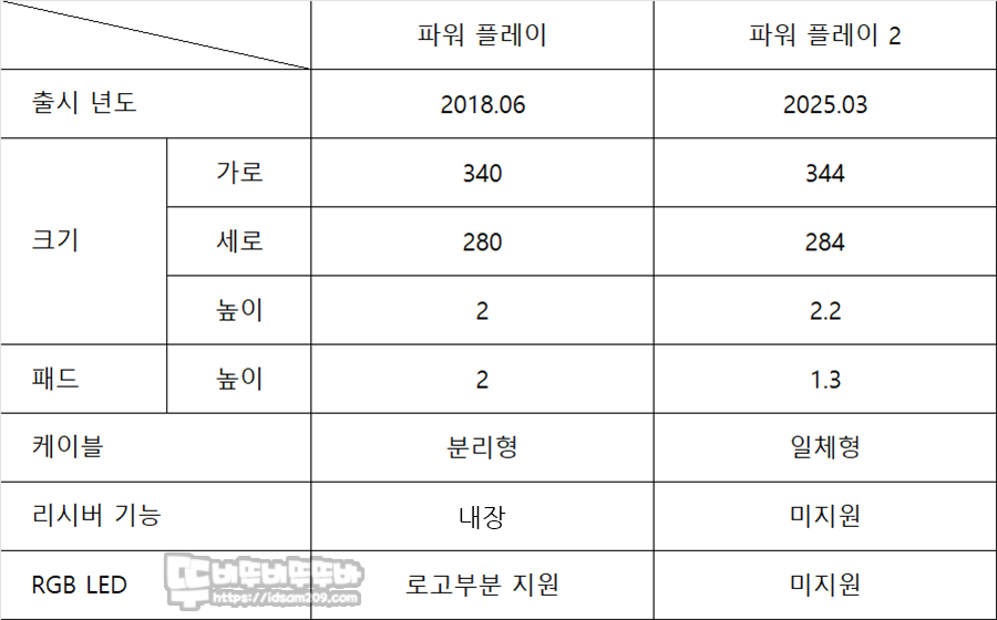 이전 파워플레이와 파워플레이2 스펙을 비교 시 눈에 띄는 부분이 작지만 넓어진 사이즈, 4mm에서 3.5mm로 얇아진 두께, 케이블 일체형, 리시버 기능 미지원, RGB LED 미지원으로 기능적으로 라이트하고 면적과 두께의 변화로 실용적인 부분에 포인트를 준 거 같습니다.