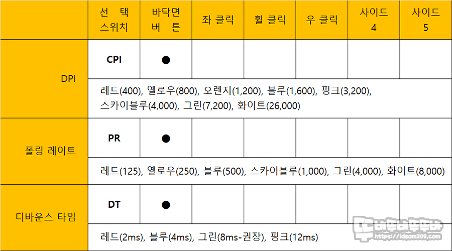 먼저 바닥면에 셀렉트 스위치는 DPI, 폴링레이트, 디바운스 타임을 선택할 수 있고요.