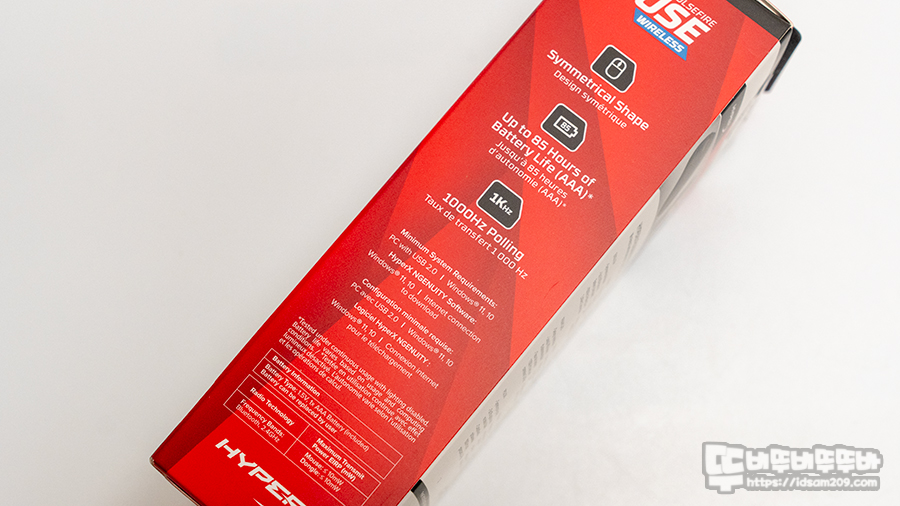인쇄 내용을 살펴보면 제품의 이미지와 컴팩트한 디자인이라는 문구, 2,4GHz & 블루투스 듀얼 무선 지원, 대칭형 쉐입, AAA 건전지 하나로 85시간 사용, 1000Hz 폴링 레이트 지원 그리고 게이밍에 특화된 브랜드답게 PC, PS5, XBox 지원하는 부분을 강조하고 있네요.