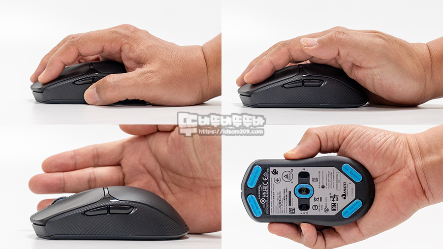 마우스의 전체적인 쉐입은 중앙 부분이 완만한 라운드 형태로 마우스 그립 시 팜 그립이 어색하지 않고 편안하게 그립이 가능하며 사이드 표면에는 미세한 사각형을 라인으로 배치하는 마이크로 라인 텍스처로 디자인되어 마우스 그립 시 미끄러지 않고 딱 부착되는 느낌을 줍니다.
