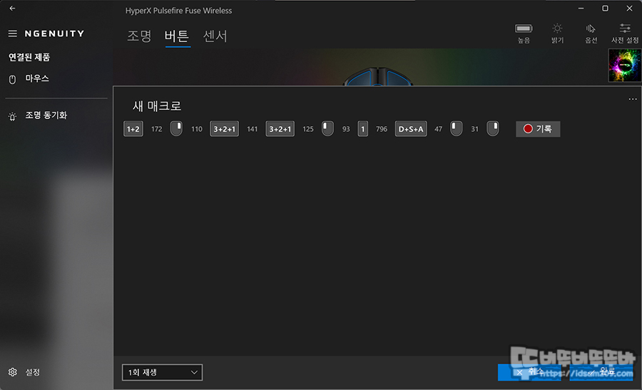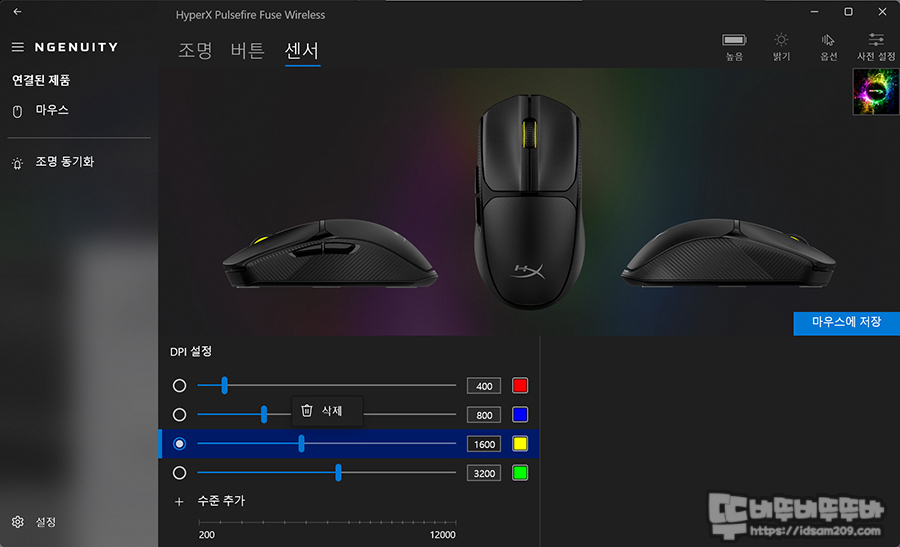 마지막으로 센서 메뉴에서는 DPI 설정이 가능한데 DPI 단계는 +버튼을 눌러 추가 그리고 DPI 컬러 변경 그리고 5단계의 DPI 설정으로 최대 12,000DPI까지 사용이 가능합니다.