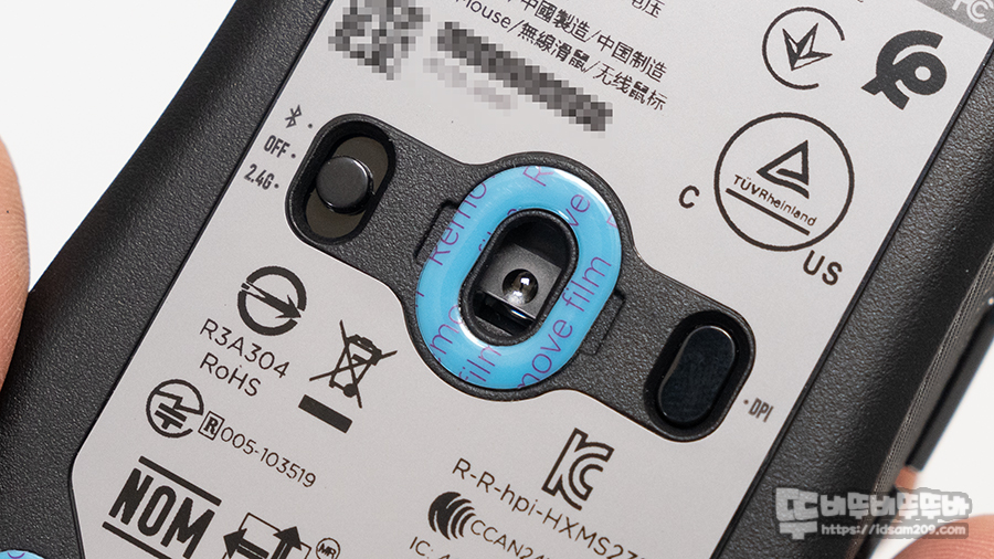 하이퍼엑스 펄스파이어 퓨즈는 124.4 mm X 64 mm X 39.7 mm 크기의 대칭형 디자인 마우스로 메인버튼+휠+사이드 버튼의 총 6개의 버튼 구조로 가장 기본적인 구성으로 설계되어 있으며 바닥면에는 블루투스 5.1 / Off / 2.4GHz 셀렉트 버튼과 DPI 버튼으로 구성되어 있고요.