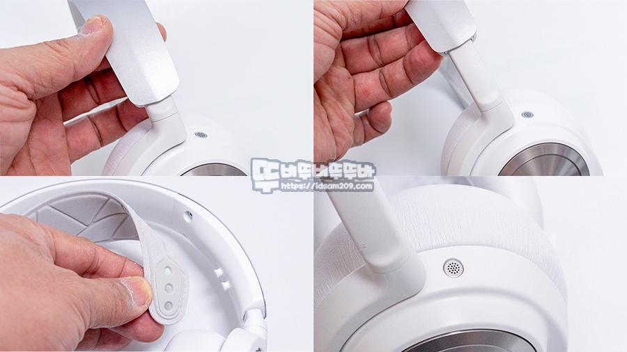 표면이 살짝 거친 헤어밴드 외부의 메탈 부분은 면적이 넓은 게 특징이며 이어컵 하우징 부분이 길이 조절이 가능하여 다양한 두상에 편안한 착용을 가능한데요.