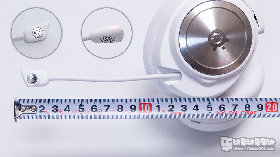 수납식으로 디자인된 마이크는 약 130mm 정도로 입꼬리 부분에 위치하여 사용하게 되는데 사용하는데 불편함은 없으며 노이즈 캔슬링을 위해 앞뒤로 마이크가 내장되어 선명한 음성 지원이 가능하며 마이크 윗단에 LED 인디케이터가 내장되어 마이크 Off 시 레드 LED로 마이크가 작동하고 있지 않다고 알려주니 참고하세요.