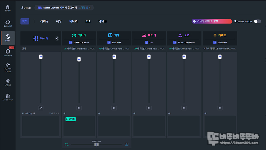 소나의 경우 믹서 메뉴에서는 다양한 항목의 볼륨 그리고 게이밍 / 채팅 / 미디어 / 보조 / 마이크 항목을 눌러 EQ 설정이 가능합니다.