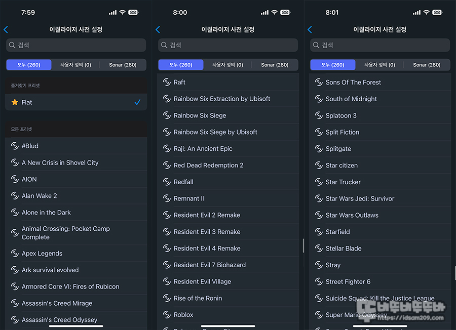 기본적으로 사운드 볼륨과 마이크 측음 그리고 공장 초기화 설정 등이 가능하며 가장 큰 특징은 다양한 프리셋을 실시간으로 적용할 수 있다는 점입니다.