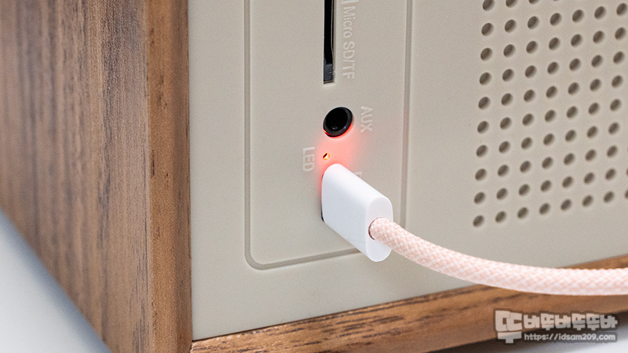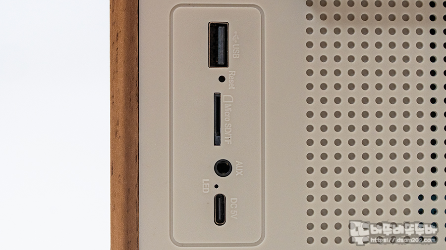 제품 후면에는 텔레스코픽 라디오 안테나와 USB/MircoSD/AUX 등 입력단자와 USB-C 충전단자 및 LED 인디케이터로 구성된 I/O로 구성되어 엔티크 느낌의 외형과 다르게 올인원 디지털 기기로 활용도가 좋은 편입니다.