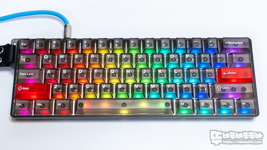 다얼유 COOL60 블랙 제품은 키캡과 하우징을 디자인을 반투명 PC(폴리카보네이트) 소재를 사용하여 LED 효과가 잘 투과되는 특징이 있습니다.