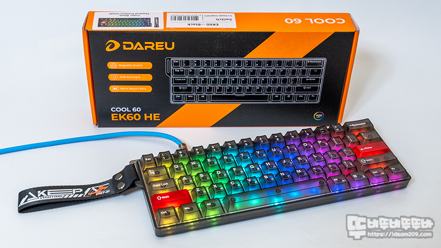다얼유 COOL60 키보드는 빠른 입력과 손가락의 반응에 대응하는 래피드트리거 지원과 8K 폴링 레이트를 지원하는 자석축 게이밍 키보드로 60% 미니 배열에 손목 스트랩 제공으로 휴대가 간편하며 광빨이 좋은 RGB LED 라이팅을 더한 화려한 외형을 지원하여 디자인과 성능 면에서 만족스러운 제품인데요.
