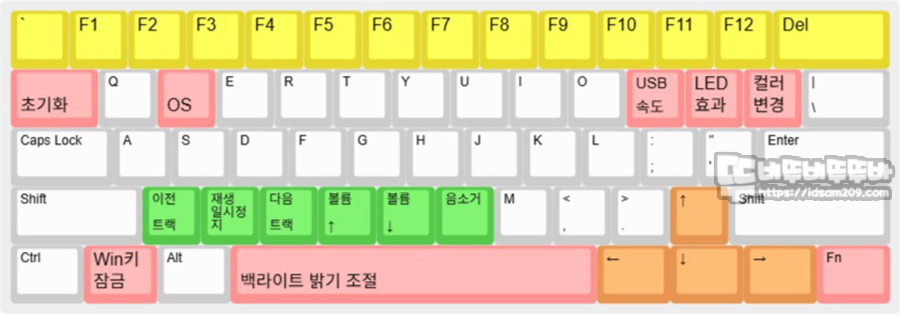 숫자열은 F펑션 기능, 초기화 (Tab), 운영체제 (W), USB 속도(P), RGB 효과 선택 ([), 단일 컬러 변경(]), Win키 잠금(Win), 백라이트 4단계 밝기 조절 (Space Bar), 멀티미디어 제어 (Z,X,C), 볼륨 제어(V,B,N) 그리고 방향키(Alt,메뉴,Ctrl,?) 기능으로 구성되어 있습니다.