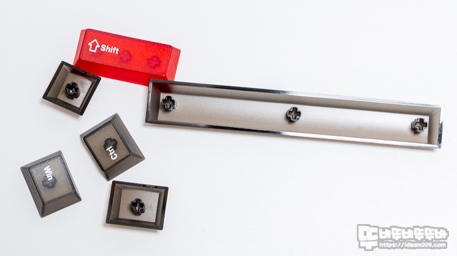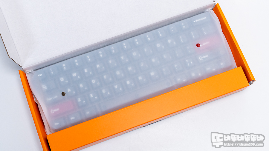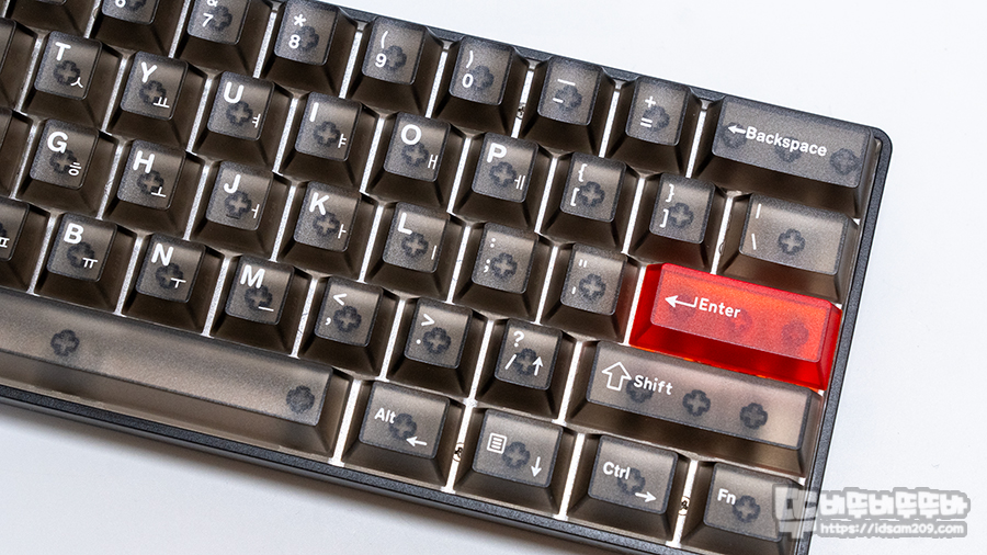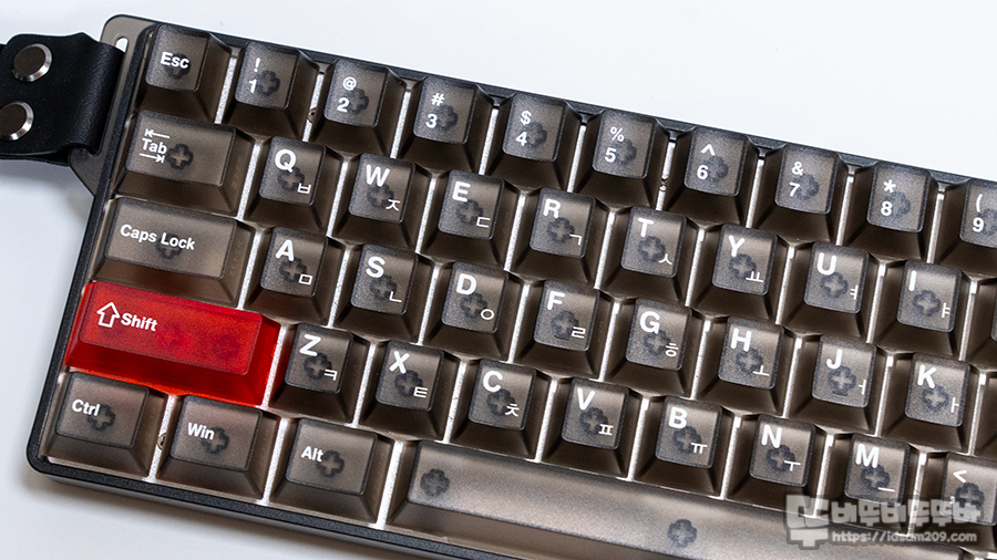 좋은 점은 PC 소재지만 끈적이는 느낌 없이 뽀송뽀송한 느낌을 주며 반투명 소재지만 영문과 한글 각인이 잘 표현되어 있습니다.