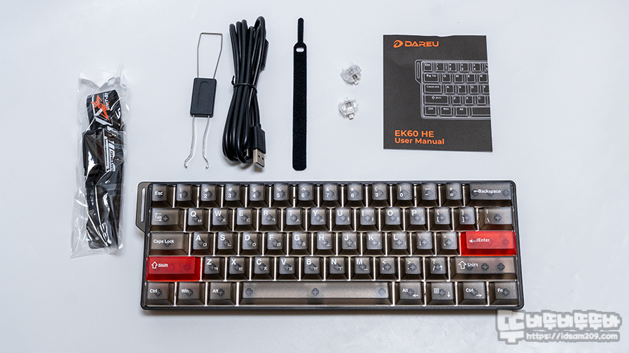 제품은 키보드 본체, 스위치&키캡 리무버, USB-C to A 케이블, 케이블 타이, 여분의 스위치 2개, 설명서 그리고 스트랩으로 구성되어 있습니다.
