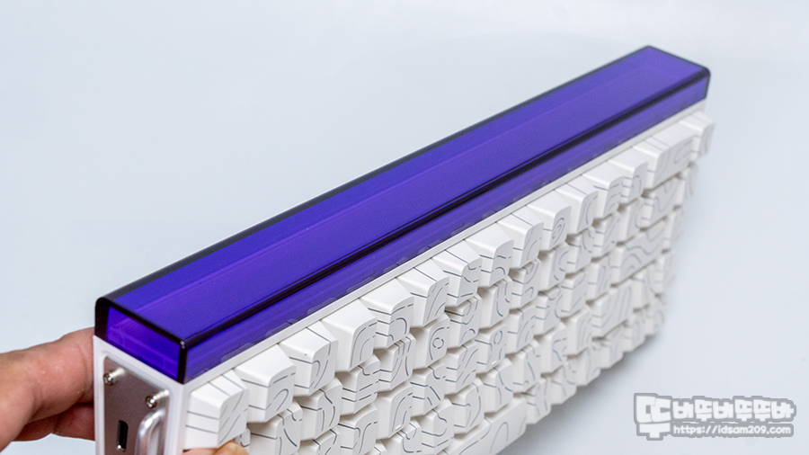 키보드의 측면은 메탈 소재가 사용되어 있는데 왼쪽 부분은 스트랩을 연결할 수 있는 고리와 USB-C 단자가 위치하고 있으며 위쪽 부분에는 보라색 투명 플라스틱이 눈의 띄는데요.
