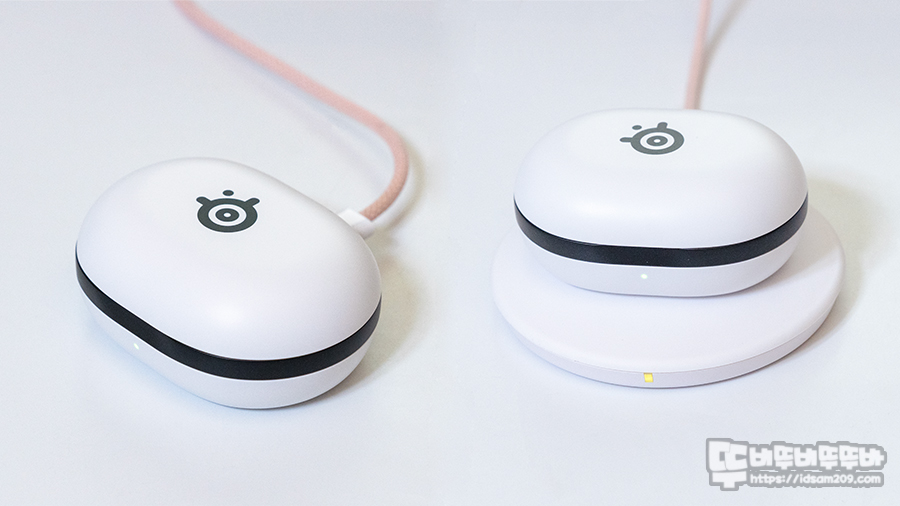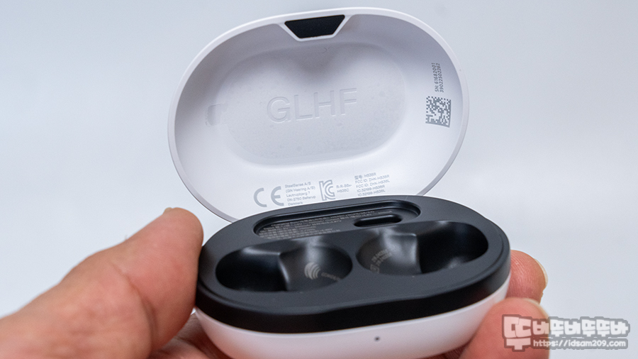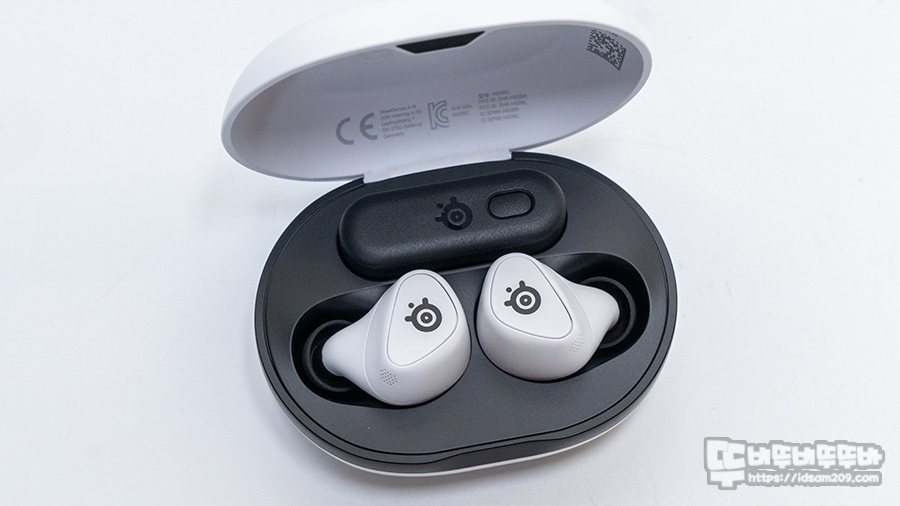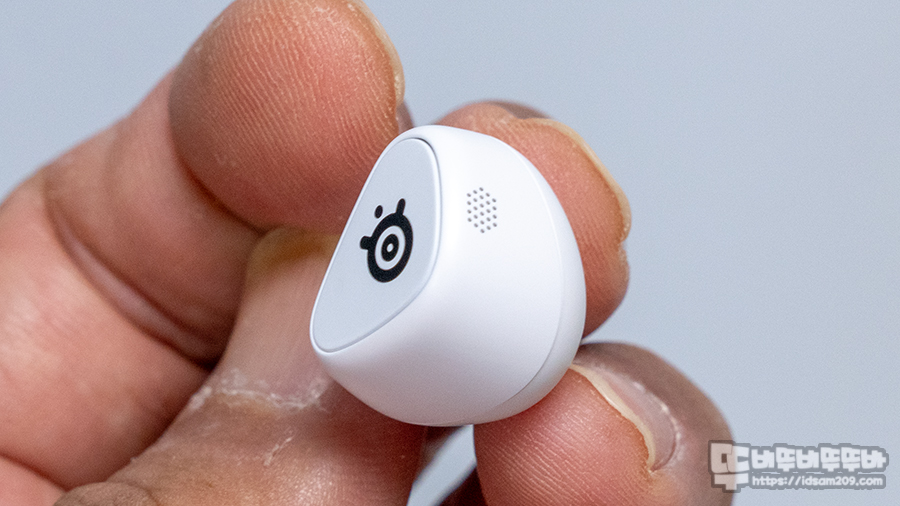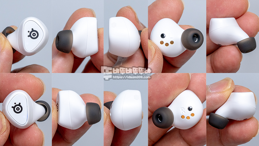 스틸시리즈 로고가 있는 부분이 스위치가 내장되어 누르는 조작으로 컨트롤이 가능하며 무선 이어버드 안쪽에는 좌우를 구분하는 L, R 표기 그리고 검정색으로 보이는 부분은 착용을 감지하는 센서로 디자인되어 귀에서 이어버드를 빼내면 작동이 멈추게 됩니다.