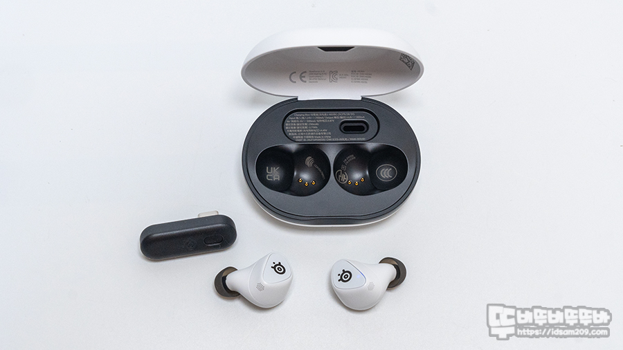 충전 케이스를 오픈하면 무선 이어버드와 2.4GHz 무선 리시버가 수납된 것을 확인할 수 있는데 무선 리시버의 USB-C 단자 부분은 실리콘 가이드에 고정되는 형태이며 무선 이어버드와 충전 케이스 커버는 내장된 자석으로 부착되는 형태로 안정감을 주네요.