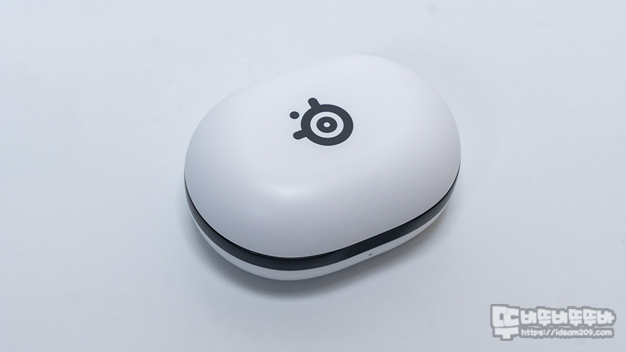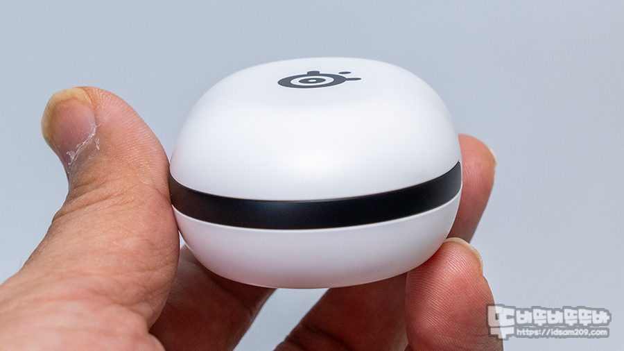 가로 약 70mm, 세로 약 50mm, 높이 약 30mm의 사이즈로 디자인된 Arctis GameBuds는 뚜껑부분이 라운드 처리되어 둥글둥글한 느낌을 주는데 검정색으로 표기된 스틸시리즈 로고가 포인트를 주고요.