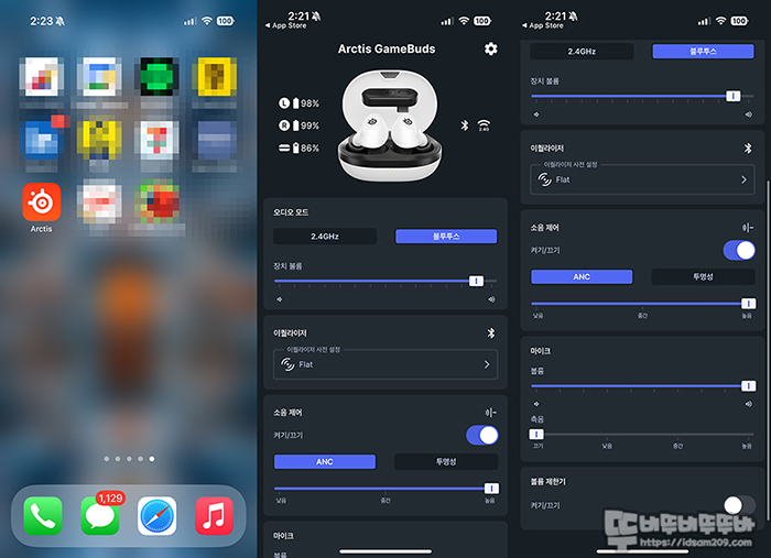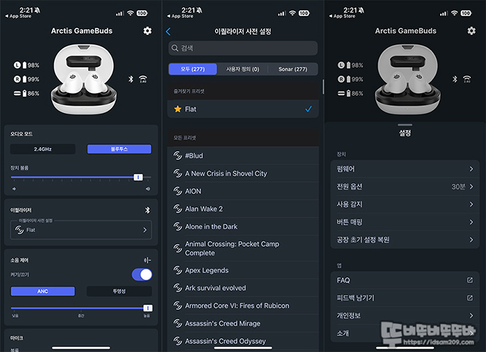 앱에서는 배터리 잔량과 2.4GHz 무선 모드 또는 블루투스 모드 선택과 277개의 프리셋으로 제공되는 이퀄라이저, 마이크 노이즈 캔슬링 강도 마이크 측음 등 설정이 가능합니다.