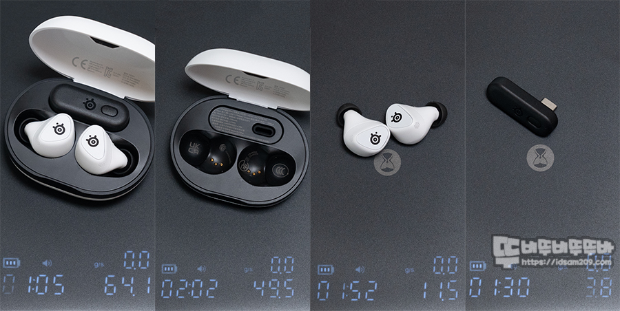 무선 충전 케이스와 2.4GHz 무선 리시버, 무선 이어버드 모습.