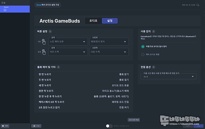 Engine에 포함된 Arctis Gamebuds 세부 항목은 오디오 (이퀄라이저/ 마이크 소음 제어/ 측음 볼륨) 그리고 설정 (버튼 설정 / 착용 감지 / 전원 절전) 기능을 설정하는 메뉴로 구성되어 있고요.