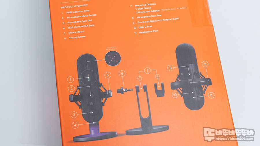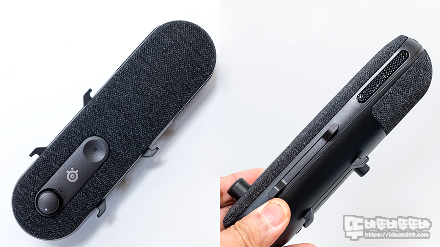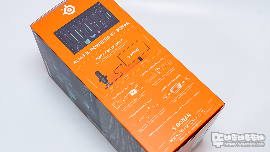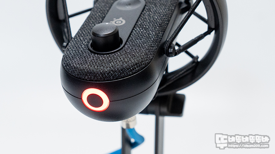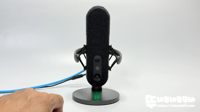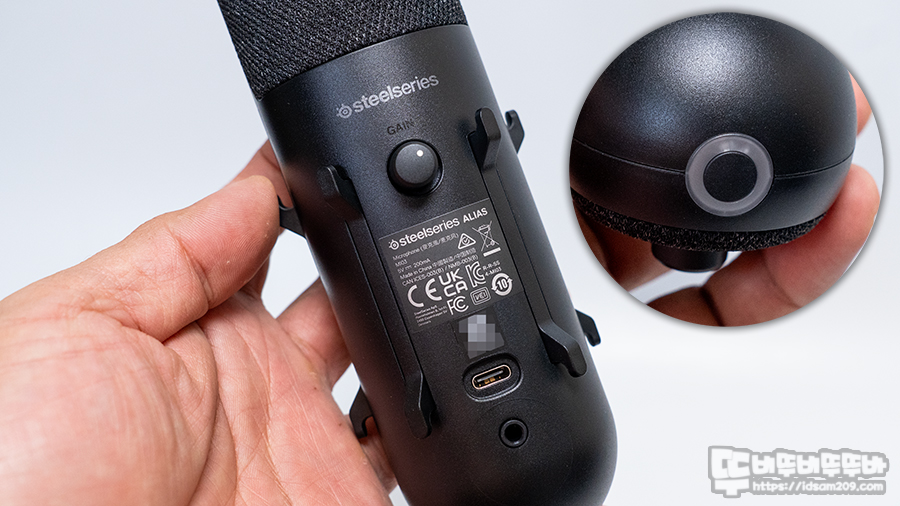 Alias 마이크 전면에 헤드폰 볼륨과 터치로 작동하는 마이크 Mute 버튼 그리고 뒷면에는 마이크 게인 다이얼과 USB-연결 단자와 3.5mm 헤드폰 연결단자, 바닥면에는 SteeelSeries GG 프로그램의 프리즘 RGB 효과를 표현할 수 있는 LED 디퓨저로 구성되어 있습니다.
