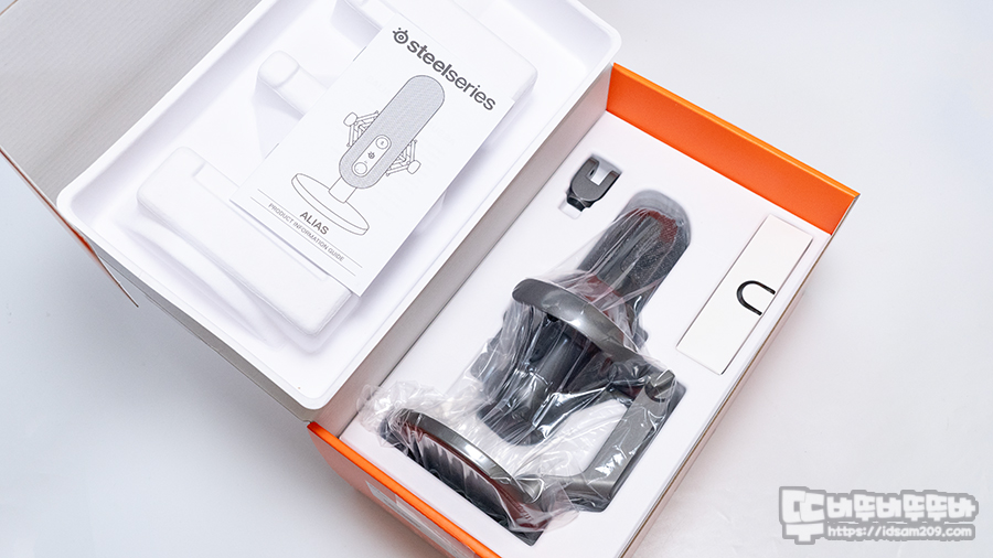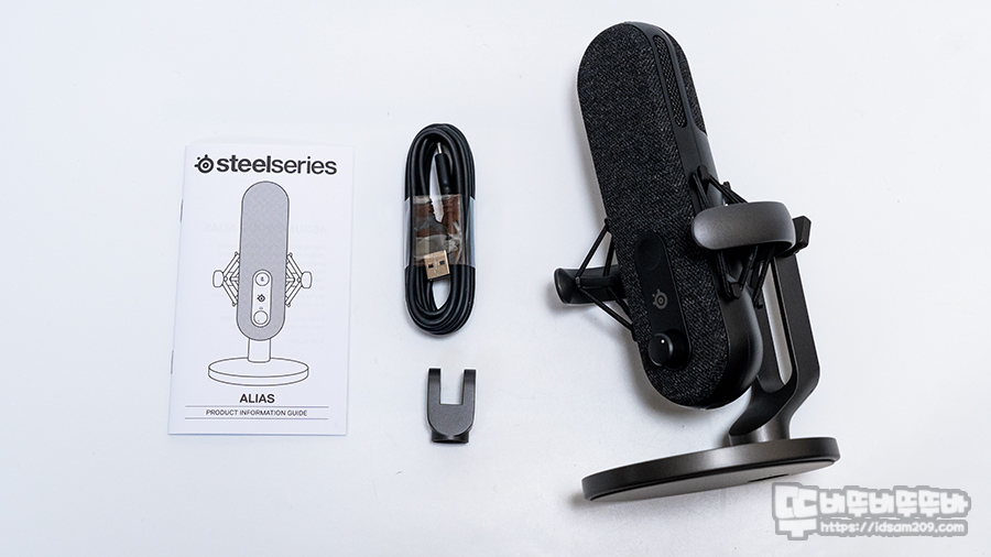 제품은 쇼크 마운트 스탠드에 결합된 Alias 마이크 본체와 USB-C to A 케이블, 그리고 마이크 스탠드(붐 암) 결합용 아답터 그리고 사용 설명서로 구성되어 있습니다.