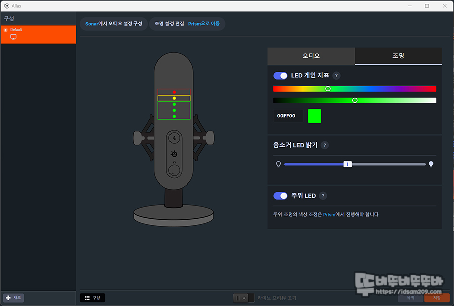 조명 메뉴는 5개의 레벨로 구분되는 음성 LED 인디케이터의 컬러는 사용자 취향에 맞게 설정이 가능하며 음소거 기능으로 표현되는 X 표시의 LED 밝기 그리고 마이크 하단에 RGB LED On/Off 기능을 제어할 수 있습니다.