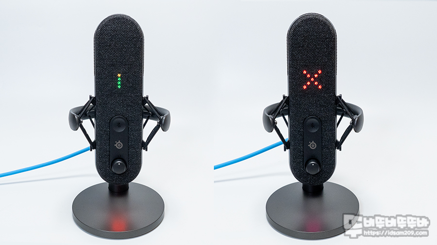 마이크 사용 시 볼륨을 나타네는 LED 레벨 표시기는 5단계 레벨로 표현되며 전면의 마이크 Mute 버튼(터치센서)으로 작동 시 X 표시로 마이크가 사용되지 않음을 표시하여 귀여움을 연출합니다.