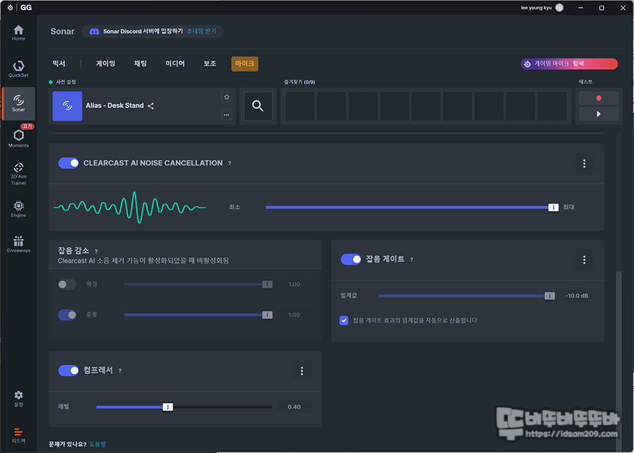 가급적 마이크를 사용하는 경우 측음 기능을 Off로 설정하시고 윈도우즈 음성 녹음기로 직접 녹음 후 재생하여 녹음된 사운드를 들어보시고 Sonar AI 노이즈 캔슬링이나 노이즈 억제 기능 옵션을 활용하시기 바랍니다.
