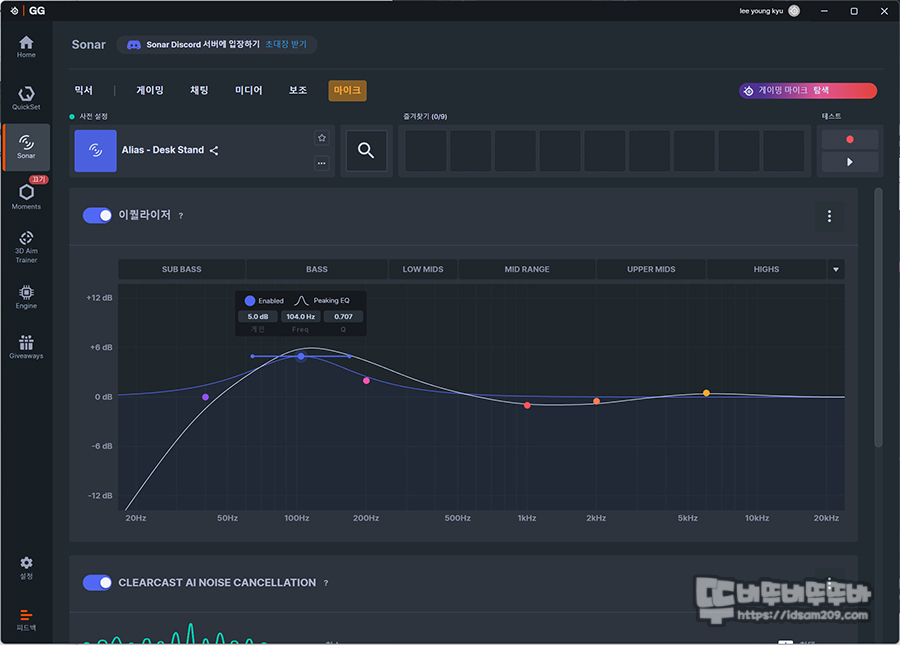 제품의 메뉴와 다르게 SONAR 메뉴를 활용하게 된다면 마이크 해당하는 메뉴에 14개의 EQ 프리셋을 활용할 수 있습니다.