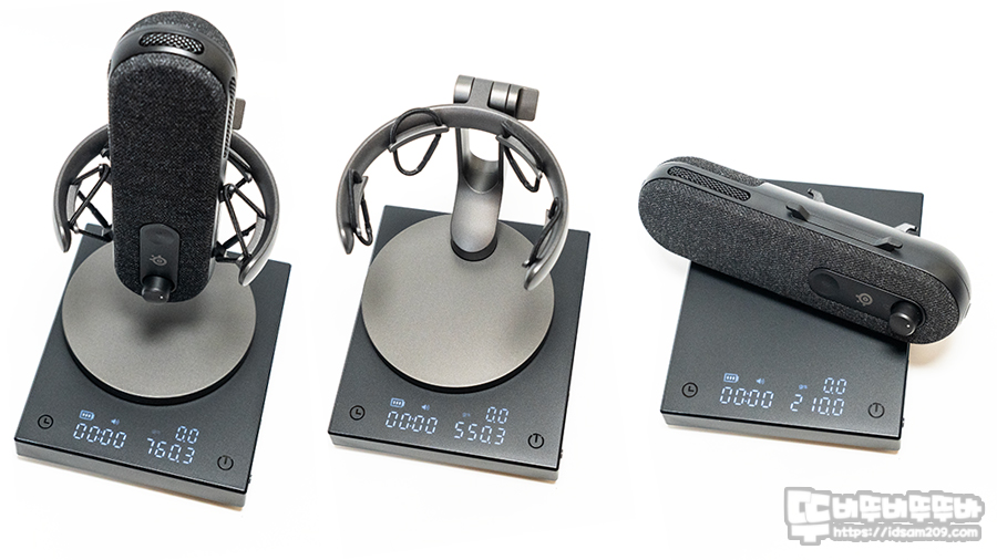 마이크의 무게를 1g 단위로 측정 가능한 디지털 저울로 측정해 보니 메탈 소재 스탠드는 약 550g, 플라스틱 소재 마이크는 약 210g으로 전체적인 무게는 760g 무게임을 확인할 수 있습니다.