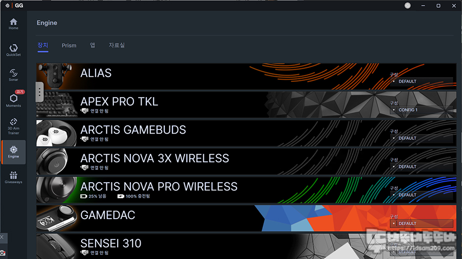 SteelSeries GG를 실행하면 Engine 항목에 등록된 ALIAS 제품명을 확인할 수 있는데요.